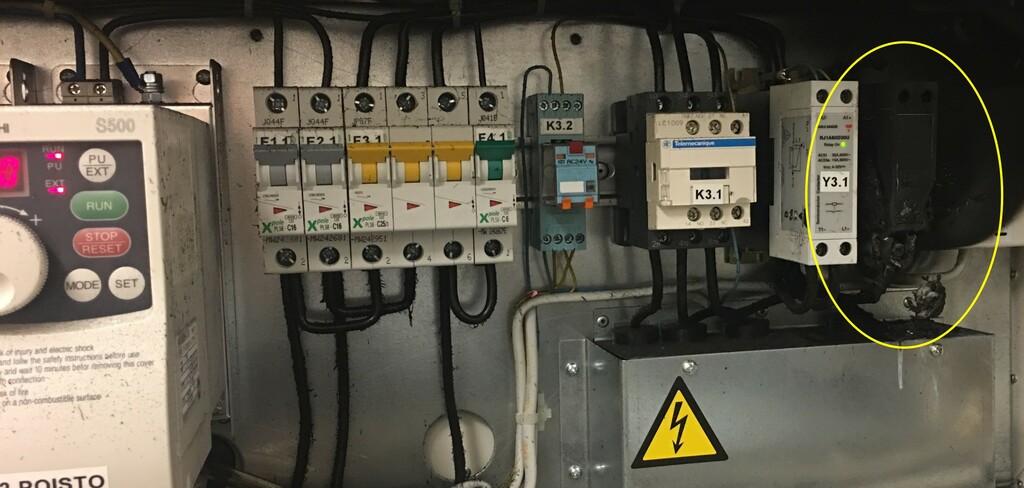 Kunnossapitäjä oli saanut aamulla ilmoituksen, että syksyn pakkasten saavuttua laitoksen tilat olivat poikkeuksellisen kylmät. Asentaja meni ilmanvaihtokojeen sähkökeskukselle ja totesi vian välittömästi avattuaan keskuksen oven. Ilmanvaihtokone toimi ulkoisesti tarkasteltuna normaalisti, mutta toinen sen lämmityspiireistä oli epäkunnossa. Lämmitysvastuksia ohjaavista releistä toinen oli palanut ja sulanut muodottomaksi. Tapauksessa oli kaikki ainekset paljon pahempaan.