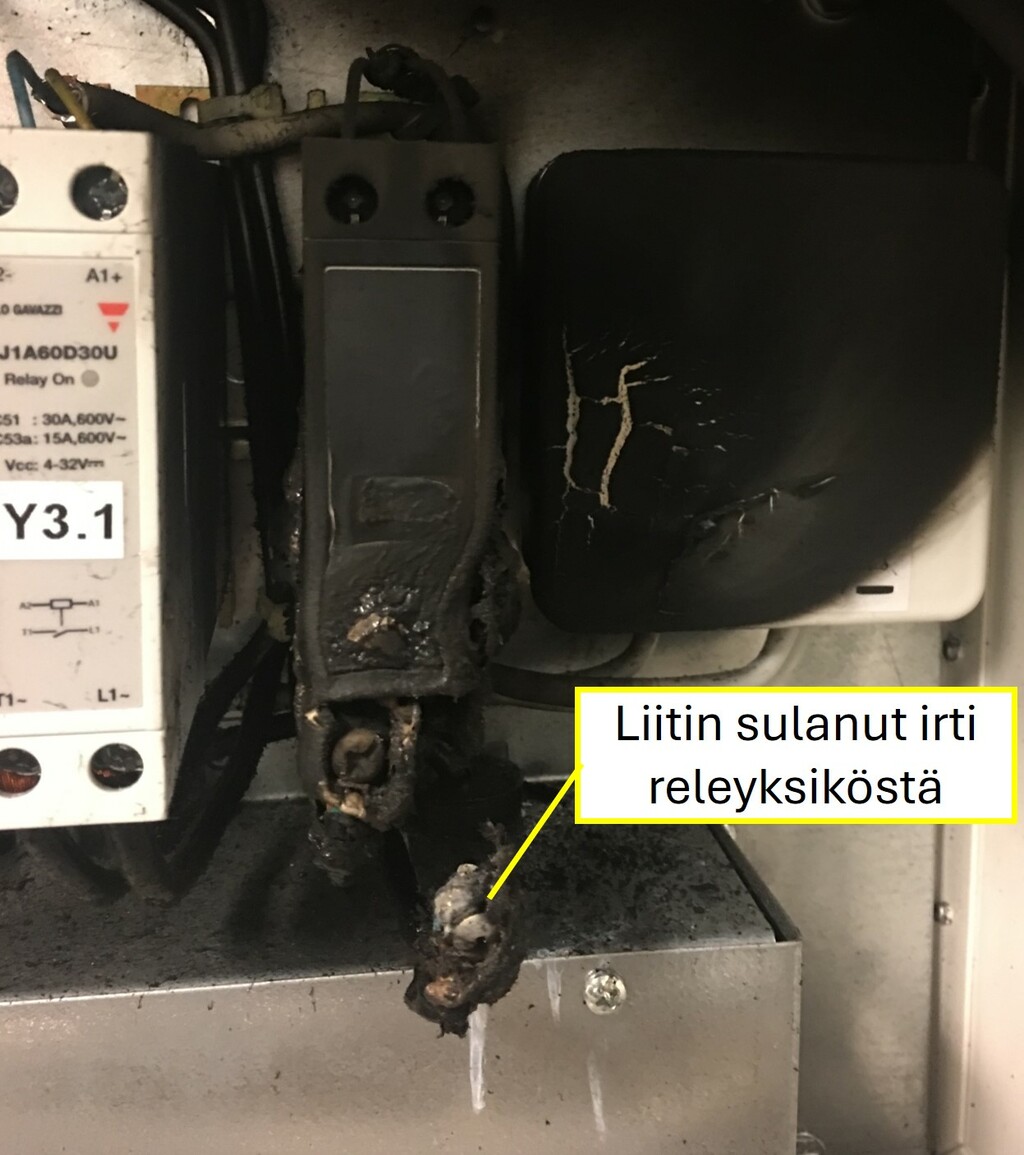 Todennäköisimmin kyseessä on ollut releessä löysälle jäänyt liitos lämmitysvastuksen johtimen ruuviliitännässä. Tämä heikko liitos on aiheuttanut liitoskohdan kuumenemisen suurilla sähkövirroilla. Liitos on alkujaan saattanut olla vain näennäisesti kiinni, mutta on sittemmin päässyt löystymään.